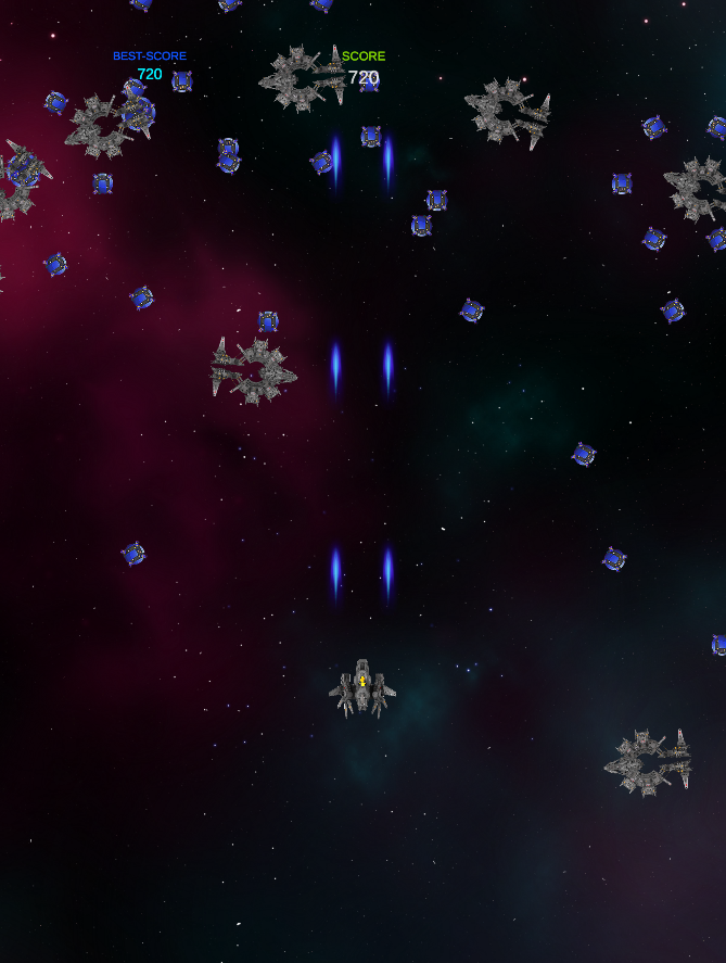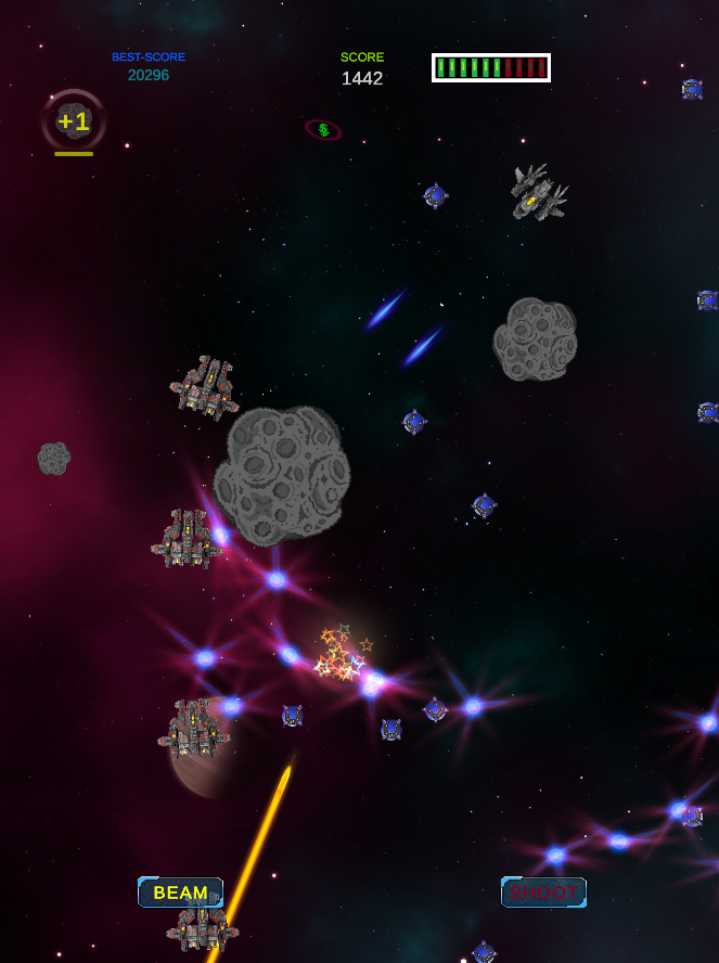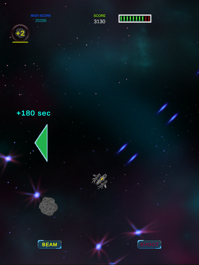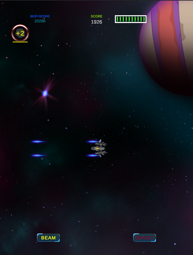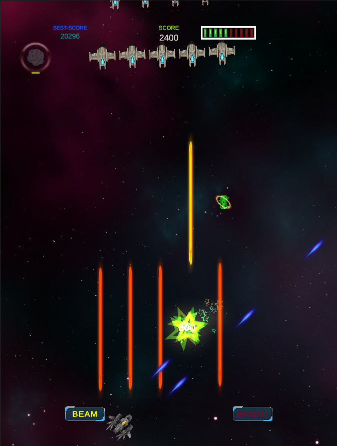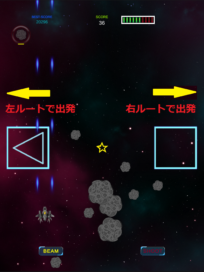 またプレイヤの機体は標準装備で、連続2発までレーザーを受けても大丈夫。数秒で回復します。